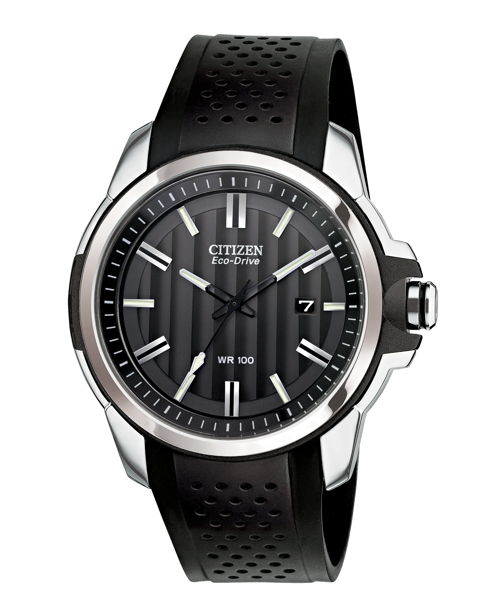 Take action and show your inner drive with the rich and sporty styling of AR 2.0. Black resin accents enhance the 44.5mm stainless steel case, while the dial sports a modern black pinstripe design. Features include date, luminous hands and 100M WR. The crown’s distinctive “D” and the pierced polyurethane strap completes this edgy look. From the Citizen Design Studios, Drive from Citizen Eco-Drive is fueled by light, any light, so it never needs a battery. Featuring our Eco-Drive technology – powered by light, any light. Never needs a battery.