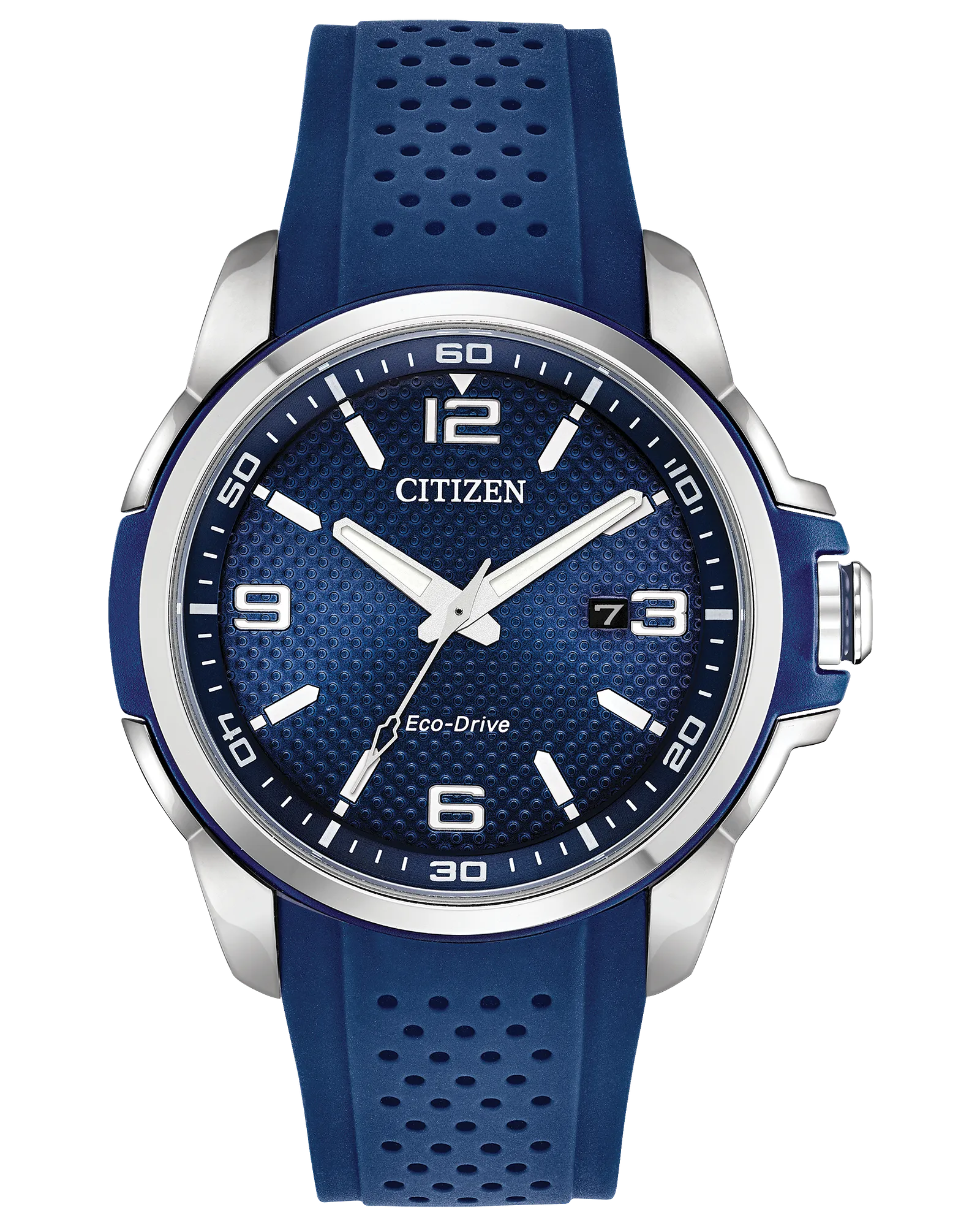 Take action and show your inner drive with the sporty styling of the CITIZEN AR, powered by light with Eco-Drive technology. Featured with a stainless steel case with midnight blue chroma finishing accents , midnight blue polyurethane strap and dark blue dial with date. Eco-Drive technology – powered by light, any light. Never needs a battery. Caliber number J810.